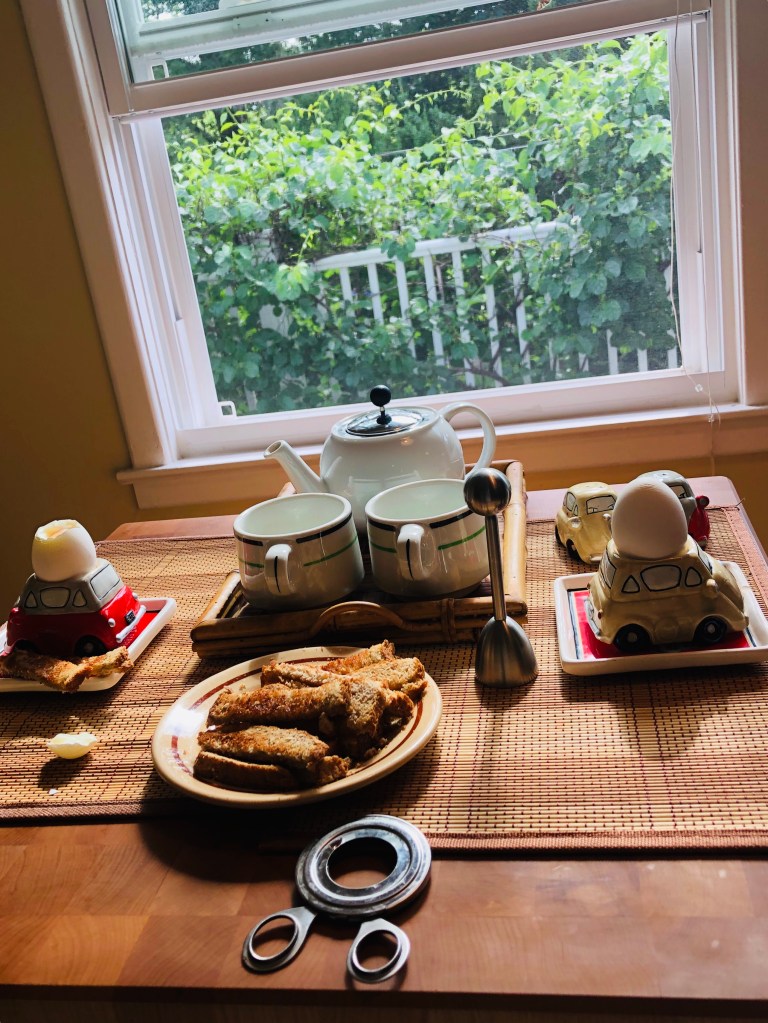 Finally, I leave you with one final meal for this blog entry: a first meal in our new home. I am sure I’ve written about one of our favorite breakfasts, “eggs and soldiers”. Nearly two months after moving in, we have plenty of unpacking to do. However, we found some of our boxes of kitchen dishes among which were the egg cups and my butcher block. Our usual practice is to have breakfast on the butcher block. Our previous house had a “breakfast nook”, a small space in a kitchen where a small meal was often served in older homes. In the new kitchen, there is a small dining space, which I will call a “nook”. We, happily, ate our eggs and soldiers with hot Earl Grey tea looking out onto the deck, and, thus, we came “home”.