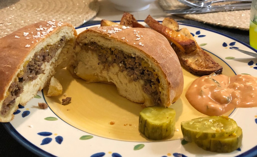 Before our trip to New York, we stopped in to see Stevie and Paige. Stevie’s innovative cooking was featured in this blog some months back. This time, he created a wrapped hamburger. He described the procedure as taking seasoned ground beef patties that he browned first. He had prepared his usual bread dough prior to preparing the beef (I realize that I am not writing the process in chronological order). He wrapped each browned pattie in a rolled-out round of bread dough. He place a sprinkling of baking salt before baking at 375 degrees (190.6 C). Also, he prepared thin slices of potatoes and lined them on a baking sheet sprinkled with the baking salt, too. He presented the tasty result to us, and we enjoyed with a glass of oatmeal stout. Delicious!