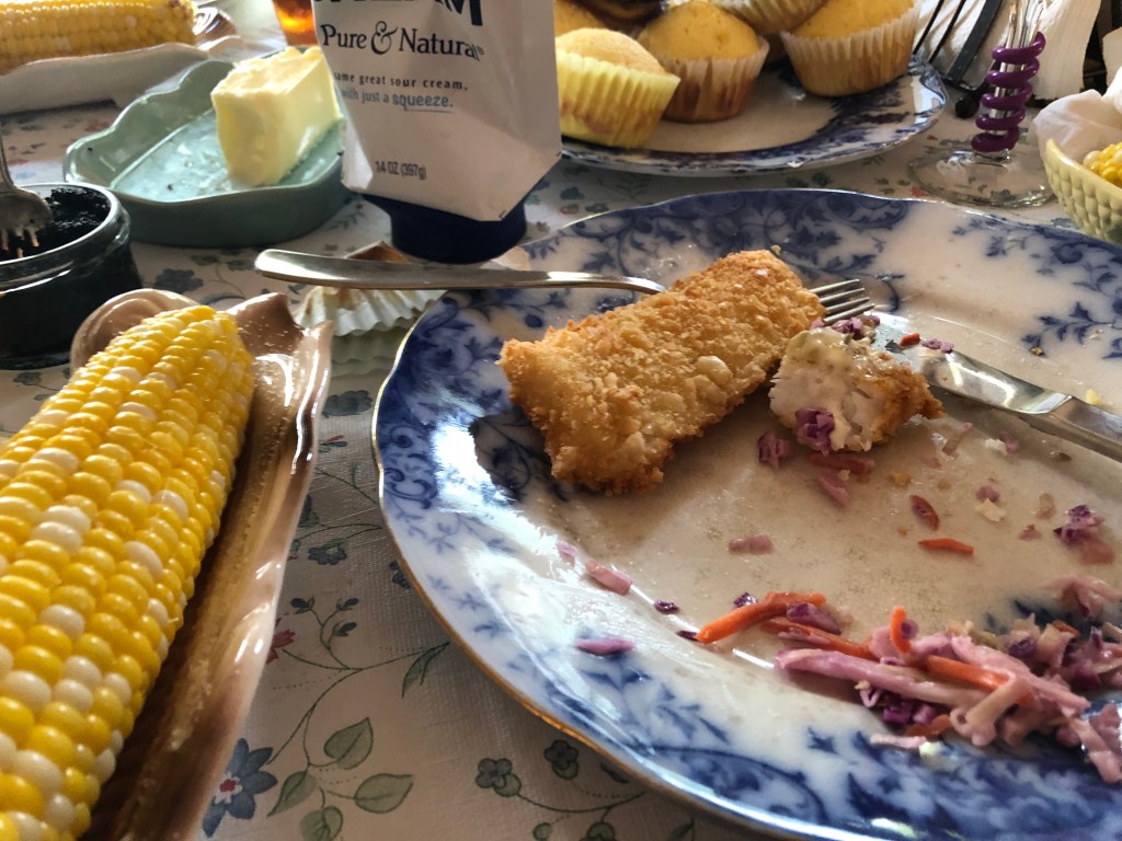 Our friends, Mark and Kathy have a cottage on a lake in New York. A most memorable meal was the evening that Kathy prepared the Walleye fish that Mark caught on preceding evening. Upon catching fish, Mark immediately filets the fish. I’ve eaten his fresh fish on the Gulf Coast, in Alaska, on a lake in Kansas, and now on a lake in New York. Kathy takes the freshly-caught fish, dips them in milk, rolls them in seasoned flour and then finely crushed saltines before placing them in hot shortening. The result is tender, flaky fish with a crunchy breading. Kathy served the fish with homemade tarter sauce brought by the neighbor, and I prepared corn muffins to go with the sour cream and Iceland caviar as an appetizer. The neighbor also shared his homemade white wine. I neglected to take pictures of the process, but I did remember to take one.