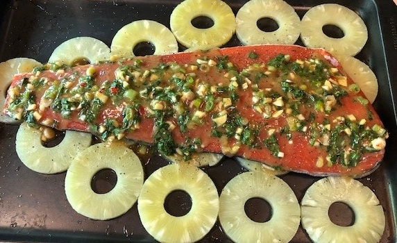 Spread the pineapple on the bottom of a baking sheet. Lay the salmon, skin side down, on top of the pineapple. Then mix the topping.