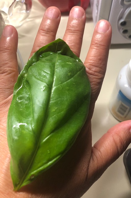 Simple ingredients: Sliced tomato, sliced mozzarella, and fresh basil leaves. Look at the size of my basil leaves!