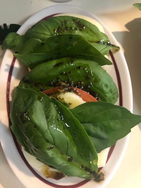 After I arrange my three ingredients (cheese, tomato, and basil leaves) on the plate. I mix a dressing of my prepared pesto with some balsamic vinegar and salt and pepper. Then, I drizzle the dressing over the salad. I find it to be a heavy salad when eaten prior to a meat-based dish. I tend to have a caprese salad with a lighter or vegetarian pasta-based main course. The gigantic size of my basil leaves hides the other two slices of tomato and cheese.