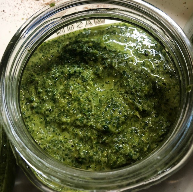 Three packed hands full of fresh mint, parmesan cheese, salt, pepper, harissa (combination of peppers), garlic, olive oil, small amount of lemon juice, and two small hands full of mixed, raw nuts (almond, walnut, hazelnut, pistachio, and cashew). Be sure to omit any nut if you have a concern about allergens. I like using raw pumpkin (pepitas) seeds for pesto. Use what ever you have on hand. Blend until smooth and aromatic.