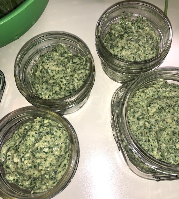 The pesto blended into a beautiful sauce easily frozen to later thaw in the vibrant color it had before freezing.