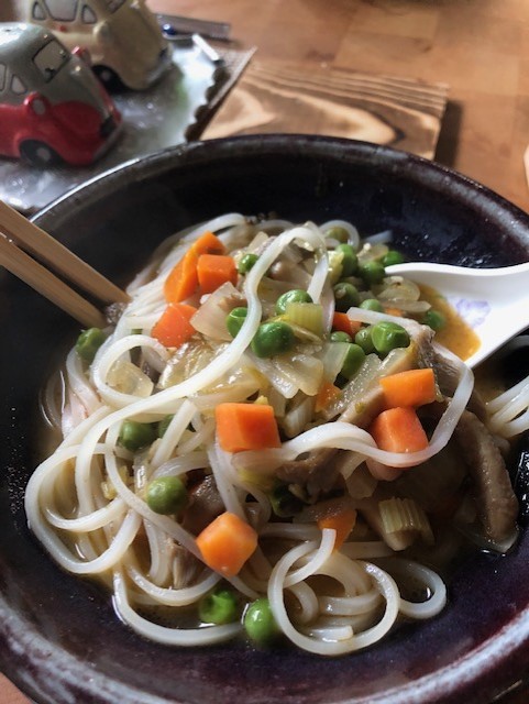 For the rice noodle soup, I began by chopping the lovely mushrooms, and adding onions, garlic, celery to sauté in butter and sesame oil. When all was fragrant, I added peas and carrots. While I cooked the mushrooms and veggies, I soaked the rice noodles in warm water. Once all the veggies were smelling most fragrant, I added two cups of vegetable broth. (You can use any type of broth. I just happened to have the vegetable broth in the freezer that I prepared from a windfall of veggies. I let the veggies and broth come to a simmer, and then I added the softened rice noodles. I added soy sauce and let it simmer for one minute, or so. It made a lovely evening meal. To finish my preparation with the mushrooms, I sautéed the remaining mushrooms in butter and put them in the freezer so that I have them for the next meal that calls for mushrooms, such as marinara sauce or in macaroni and cheese, or what ever dish calls for mushrooms.