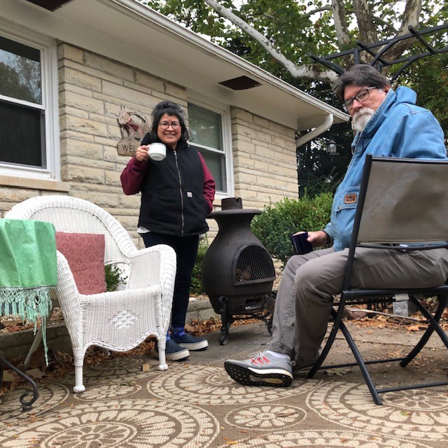 Enjoying a hot cup of tea on a crispy morning in front of the outdoor fire place