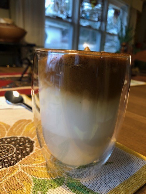 This “Dalgona” coffee was made by whipping the instant coffee in two tablespoons of hot water. The middle layer is frothy milk, and the bottom layer comes from the frothy milk and whipped coffee blending.