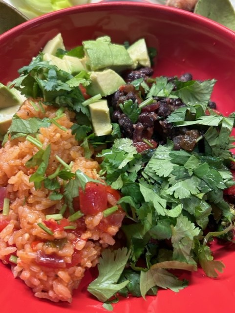 This is a black bean burrito bowl. It can be vegan, but I used chicken stock to make the Spanish rice.