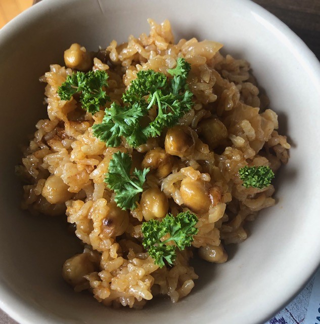 With the two illustrations of rice dishes, I found these recipes online. Remember, when you cook with dry beans (garbanzo or black), since they are likely not “new crop” means that you must soak the beans to re-hydrate them before cooking. I don’t have access to new crop garbanzo or black beans, so I do soak and rinse before cooking them. Always add boiling water to your cooking pot. It helps the beans maintain their color and it helps them hydrate quicker in the cooking process.